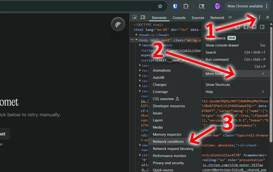 Open the Network conditions panel. To do this, click the three dots in the upper-right corner of DevTools → More tools → Network conditions.